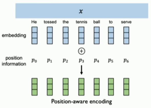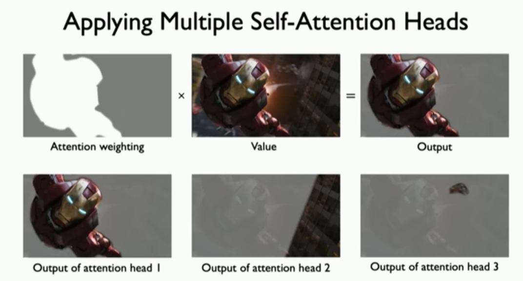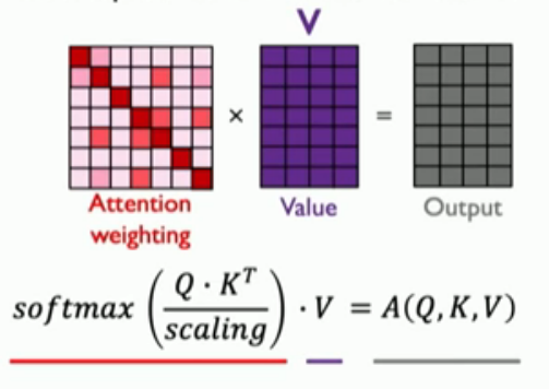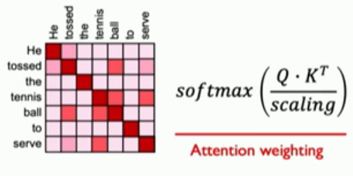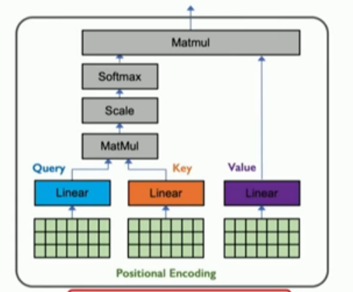 This is done by getting a query, key and value, which are got by multiplying our input (positional embedding) 3 times by different matrices related to query, key and value: